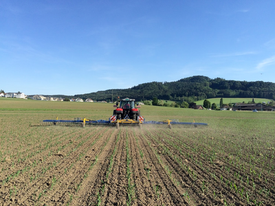 Striegel (15m), kameragesteuertes Hackgerät, Einsaat der Untersaat mit pneumatischem Düngerstreuer