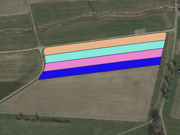 Der Versuch findet im unteren Teil der Parzelle Rütteli statt (Abbildung). Nach der Ernte der Vorfrucht Winterweizen fanden zwei Grubberdurchgänge statt. Ziel des ersten Grubberdurchgangs war die Einmischung der Ernterückstände des Winterweizens. Hingegen sollte mit dem zweiten Grubberdurchgang eine tiefe Lockerung (30 cm) erreicht werden. Die Durchführung der tiefen Bodenbearbeitung kann so im Sommer unter optimalen Feuchtigkeitsverhältnissen durchgeführt werden. Eine tiefe Bodenbearbeitung im Frühjahr ist oft nachteilig, da dann der Unterboden oft zu hohe Feuchtigkeitsgehalte aufweist und der ungelockerte Boden im Winter weniger ausfriert.