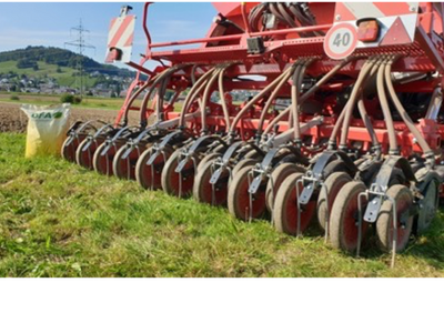 Anschliessend wurden vier unterschiedliche Gründüngungen mit 30 cm breiten saatfreien Streifen in regelmässigen Abständen von 75 cm ausgesät. Die Streifenaussaat wurde durch eine geschickte und einfach umzusetzende Modifikation an der Sämaschine (Reihenabstand von 15 cm) umgesetzt. Die vier verschliessbaren Abgänge des Verteilturms, die für die Fahrgassenschaltung vorgesehen sind, wurden anderen Säscharen zugeordnet und konstant geschlossen gehalten. Dadurch wurde an vier Säscharen auf drei Metern Arbeitsbreite kein Saatgut ausgebracht. Im Frühjahr 2021 wird dann Körnermais dank der Nutzung des Lenksystems präzise und direkt in die 30 cm breiten Lücken gesät. Das Spurführungssystem verwendet ein RTK (Real Time Kinematic) Korrektursignal, das sich durch die hohe statische Genauigkeit auszeichnet. So kann die Maissaat zentimetergenau in die 30 cm breiten Streifen ohne Gründüngung erfolgen. Während der Saat wird die Messerwalze im Frontanbau dafür sorgen, dass die überwinternde Gründüngung wachstumsunfähig gemacht wird. An der Sämaschine werden Räumsterne die Saatreihen von allfälligen Überresten der Gründüngung befreien.